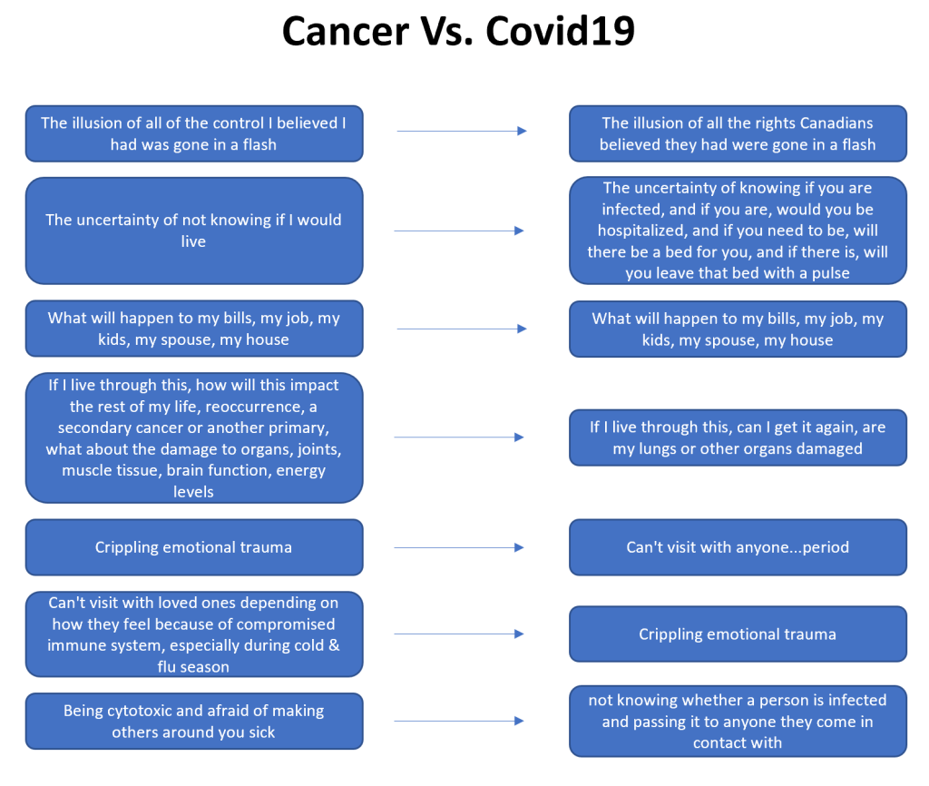 Once I acknowledged the reality of the situation we all find ourselves in, it occurred to me that what the entire world was experiencing was familiar to me. Seeing the reaction of humanity reminded me so much of the day I was diagnosed with cancer and the days that followed: